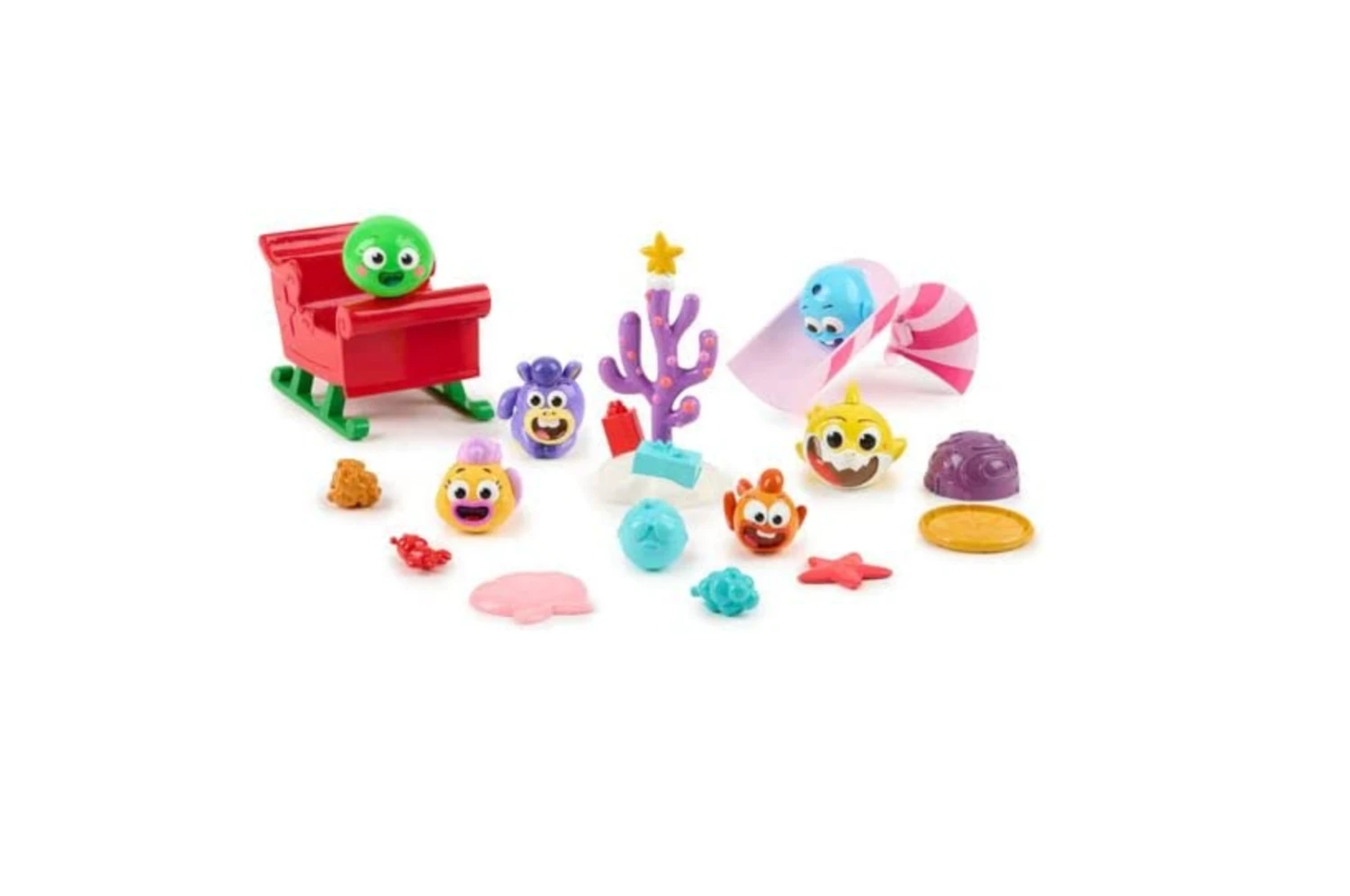 Includes : 6 figures – 8 accessories – 2 fishmas presents – 4 fishmas stickers- 1 fishmas tree in 2 pieces – 1 santa jaws sleigh in 2 pieces – 1 candy cane slide in 2 pieces – 1 ice rink – 1 instruction manual